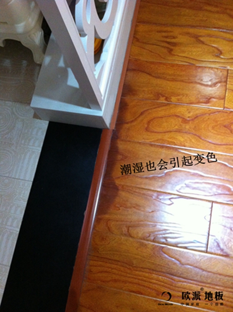 当然说到变色我们不能忘了水这个破坏分子,处于卫生间和厨房等潮湿区,外来潮湿水气的影响也会导致局部地方地板变色。