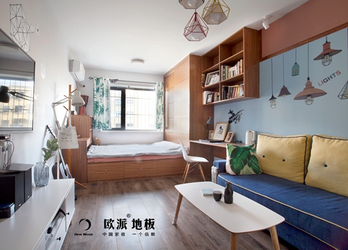 安装的强化地板是锁扣结构的,地板与地板之间通过榫舌和榫槽对接拼合在一起,不需要用到地板胶等。拼接的时候,先将两块地板对准,然后压平。为保证地板拼无缝隙,还需借助一些工具敲打使之紧密。这样做能有效防止地板起翘等问题的出现。按照这样的方法,依次安装,将房间铺满。